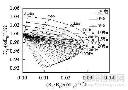 經有限元計算可知,在不銹鋼件形變20%以內,不同形變下,線圈阻抗變化不同,如圖5a所示,且隨形變量的增大,試件中馬氏體含量增加,磁導率增大,線圈阻抗變化增大,這在低頻段尤為明顯,同時,不同頻率點所對應提離變化也有差異。