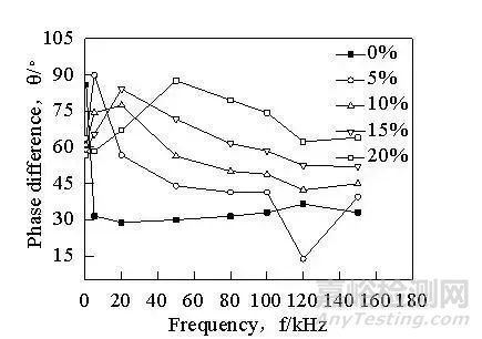 隨試件形變量的增加,頻率越低,θ值增大,表明當奧氏體不銹鋼在制造或在役中,由于試件產生微量形變后,產生了馬氏體相變,改變了試件本身的磁導率值,使其具有鐵磁材料的一些磁特性,進而導致渦流檢測最佳檢測頻率發生了變化,當頻率低于100kHz時,電導率信號和提離信號有較大的相位差,而且這種相位差使得缺陷檢出效果要優于試件磁導率μr=1時渦流檢測效果,例如在激勵頻率為50kHz時,形變量0%、5%、10%、15%和20%對應的θ值分別為30°、44°、59°、74°和89°。