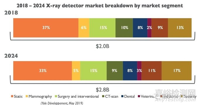 CT探測器是所有X射線影像設備探測器中技術最難的,同時,CT探測器的制造工藝極為復雜,屬于半導體封裝的一個特種分支,且精度要求極高,要實現CT探測器的穩定量產更是難上加難。據專注于半導體研究和市場分析的國際知名咨詢公司Yole Développement的數據,CT探測器占整個X射線類探測器市場10%左右的市場份額,預計到2024年將達2.8億美金(折算為人民幣約20.5億元)市場規模。