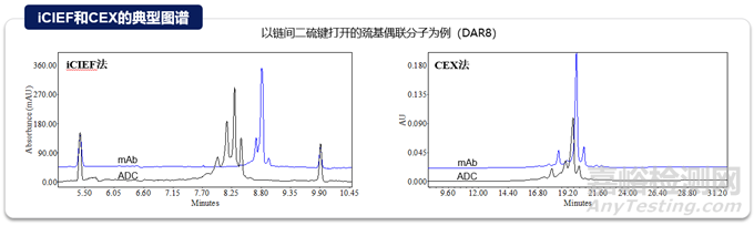 與抗體一致,ADC的電荷變異體是關鍵的質量屬性,因為它們對穩定性和生物活性有潛在影響。在ADC中可以觀察到各種形式的與電荷相關的異質性,貢獻這些異質性的因素包括抗體自身展示的電荷變異性、偶聯工藝過程引入的修飾、小分子藥物本身的結構以及在不同偶聯位點引起的電荷變化等。常規分析技術如離子交換色譜(Ion Exchange Chromatography,IEX)或者等點聚焦電泳(iCIEF)可以實現電荷變異體的監測。常規的電荷變異體表征策略也適用于ADC分子,富集單一變異體組分后,進行完整水平(Top-down)、亞基水平(Middle-down)或肽段水平(bottom-up)質譜解析。