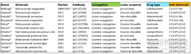 DAR(Drug-to-Antibody Ratio),即藥物小分子與抗體分子的數量比例,可指示平均每個抗體上偶聯上的小分子藥物個數。DAR與ADC的療效和安全性直接相關,低載藥量(低DAR)會降低ADC的效力,而高載藥量(高DAR)會改變ADC分子的藥代動力學和毒性。常規用于定量DAR的方法有光譜(UV-Vis)、色譜(HPLC)和質譜(LCMS)等。如下圖所示,已上市ADC產品在DAR分析質控上主要是光譜和色譜這兩類技術。