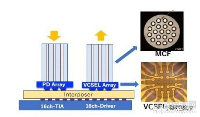 概述如圖 5所示。我們使用 16 芯光纖 (MCF),其中有 19 個單模芯。信號通過光學耦合到集成了每個位置對應的16個VCSEL和PD的二維陣列芯片,并傳輸數據。VCSEL使用InGaAs QW(量子阱)作為有源層,具有金屬孔徑(MA)結構,并以1060 nm的振蕩波長從背面發射光。發射的光為單模,模直徑約為5um。它耦合到單模芯(簡正模直徑 9um),無需透鏡。接收側也是背照式 InGaAs PD 的二維陣列,與光纖直接進行光耦合。