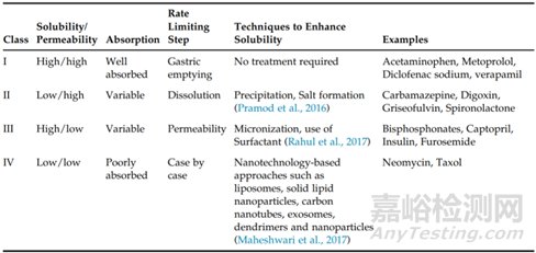 圖1.BCS分類系統(tǒng)圖示,根據(jù)藥物的滲透性和溶解性對(duì)藥物進(jìn)行分類。當(dāng)存在于最高濃度速釋制劑中的藥物量在胃腸道pH值(1.2-7.5)的可能范圍內(nèi)可溶于250毫升水中時(shí),化合物被定義為高溶解性。高滲透性化合物定義為吸收率為>90%或通過體外或體內(nèi)方法評(píng)估的滲透性等于或高于吸收率為90%的參考化合物的化合物。(來源于參考文獻(xiàn)1)