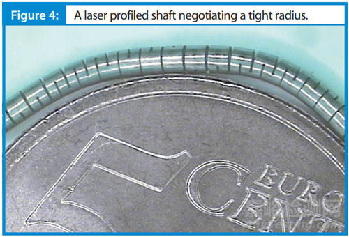 這里描述的是通過激光切割的方式制備柔性的不銹鋼軸;在此應(yīng)用中,304不銹鋼材質(zhì)的海波管以正常方式進(jìn)行加工和鈍化處理;使用脈沖Nd-YAG激光器(Rofin-Baasel4)在不銹鋼管上切割出預(yù)設(shè)的圖案。激光束切割寬度的切縫小于20µm,同時(shí)會(huì)造成最小為5µm的熱影響區(qū)。在這個(gè)例子中,激光切割系統(tǒng)最初設(shè)計(jì)用于切割冠狀動(dòng)脈不銹鋼支架,但它已經(jīng)被廣泛應(yīng)用于切割定制化的長(zhǎng)條形不銹鋼管材;在這種設(shè)計(jì)中,激光束被固定,而管子在激光束下旋轉(zhuǎn)并向前進(jìn);當(dāng)激光正確聚焦時(shí),激光會(huì)穿過管壁。一旦管材輪廓已被切割成型便進(jìn)行清洗和鈍化,并且可以在切割的表面套上一個(gè)高分子外套;這種外套可以通過很多方式在導(dǎo)管軸上實(shí)現(xiàn)。以目前的技術(shù),最具成本效益的選擇是將高分子外套直接通過包覆擠出的方式覆蓋在不銹鋼軸上;其他方法包括熱收縮,其中聚合物外殼通常在100℃的溫度下收縮到軸上。