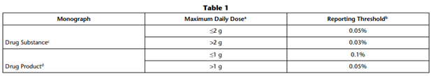 不同最大日劑量相對應(yīng)的報告閾值的數(shù)值如下所示,國際人類用藥技術(shù)要求協(xié)調(diào)理事會(ICH)指南:Q3A(R2)“新藥中的雜質(zhì)”和Q3B(R2)“新藥品中的雜質(zhì)”,轉(zhuǎn)載于表1