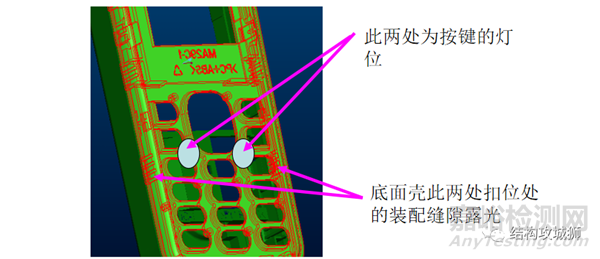 1,結構上存有能使光直接射出的縫隙而露光,無擋光的結構或擋光的位置不夠,如底面殼按鍵側有被切斷的止口處,按鍵間隙處等。