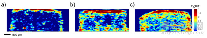 標準化定量超聲成像(SQUI)方法可視化分析了生物支架的微觀結(jié)構(gòu)和總體形態(tài),并對2D原始灰度圖像與其對應(yīng)的局部衰減和IBC圖像進行了比較。2D-IBC圖像顯示了GelMA濃度的顯著差異。基于IBC圖像與顯微鏡圖像的相似性,假設(shè)高強度IBC特征歸因于ECM(細胞外基質(zhì))的區(qū)域。3D圖像顯示了全局和閾值化IBC值。然后處理了生物支架足跡上每個柵格掃描平面的標準化2D-IBC圖像,并結(jié)合處理后的2D-IBC圖像形成了3D-IBC圖像。