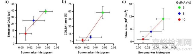 探討了Sonomarker強度與生物標記之間的相關(guān)性。使用線性回歸分析比較了聲學標記直方圖與軟骨形成第28天時的主要生物標記(GAG、COL2A1和膠原纖維)之間的關(guān)系。聲學標記的強度與這些生物標記顯示出良好的相關(guān)性。