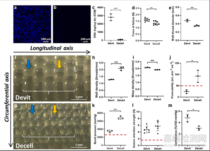 本文所有實驗都是使用"脫細胞"的CAM進行操作。雖然已有數據表明異體"脫細胞"CAM具有良好的耐受性,但研究人員仍進行了脫細胞過程對編織TEVG力學性能的影響研究,促進ECM處理方法進一步發展。圖5顯示去活力或脫細胞CAM片編織的TEVG特性比較。DAPI染色和DNA定量證實CAM片脫細胞過程有效。DNA含量降低97%。單軸拉伸測試結果,脫細胞帶的破壞力(-13%)略低于去活力帶。脫細胞帶制成的緯線直徑明顯小于去活力帶制成的緯線直徑,與之前結果一致,使表面波紋顯著減少。與去活力化移植物相比,脫細胞TEVG的經線明顯更寬,緯線密度更低。在TEVG脫細胞后,緯線密度增加62%,經線密度降低10%。脫細胞移植物的內徑也略小(7%),但壁薄得多(35%)。去活力TEVG與脫細胞TEVG之間最重要的區別是,脫細胞TEVG的透壁通透性要高得多(288%)。與去活力TEVG相比,脫細胞TEVG的爆破壓明顯更高(96%),但縫合保持強度不變。最后,脫細胞TEVGs的順應性明顯降低,與爆破壓增加情況一致。