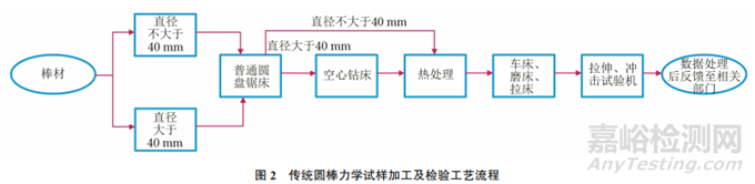 GB/T 2975—2018《鋼及鋼產(chǎn)品 力學(xué)性能試驗(yàn)取樣位置及試樣制備》中規(guī)定:在對(duì)圓形橫截面進(jìn)行機(jī)械加工時(shí),優(yōu)先采取原始直徑為20,10,5mm的圓棒試樣。當(dāng)圓棒直徑超過40mm時(shí),將鋸切后的樣坯用普通車床直接車削為符合標(biāo)準(zhǔn)規(guī)定直徑的樣坯,這種處理方法對(duì)車床的沖擊傷害比較大。因此,對(duì)于直徑大于40mm的圓棒,可以采用空心鉆床套取其鋸切后的樣坯;對(duì)于直徑小于40mm的圓棒,可以將其鋸切后,直接采用車床、拉床等方法制備拉伸、沖擊試樣。加工完成后,將制備好的試樣人工送入拉伸、沖擊試驗(yàn)機(jī)。需注意的是,通常在試驗(yàn)前需對(duì)圓棒力學(xué)試樣進(jìn)行熱處理,傳統(tǒng)圓棒力學(xué)試樣加工及檢驗(yàn)工藝流程如圖2所示。