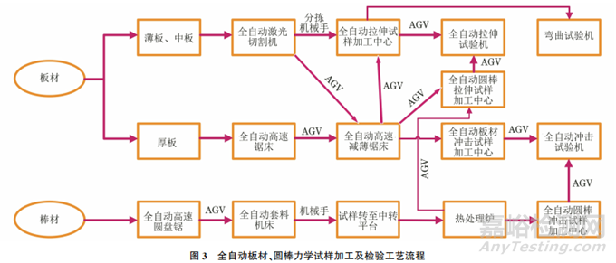 典型的板材全自動(dòng)切割及試樣加工系統(tǒng)由全自動(dòng)激光切割機(jī)、機(jī)械手、多功能試樣加工中心、沖擊試樣加工中心、自動(dòng)導(dǎo)向車(AGV)傳輸系統(tǒng)等組成,工藝流程如圖3所示。GB/T 229—2020 《金屬材料 夏比擺錘沖擊試驗(yàn)方法》規(guī)定沖擊試樣標(biāo)準(zhǔn)尺寸(長(zhǎng)×寬×高,下同)為10mm ×10mm ×55mm,沖擊試樣加工中心一般是將尺寸為12mm×12mm×55mm的試樣加工成尺寸為10mm×10mm×55mm的標(biāo)準(zhǔn)試樣,若來料尺寸大于12mm×12mm×55mm,則可能不利于設(shè)備運(yùn)轉(zhuǎn)。因此,當(dāng)用厚度大于12mm的板材制備沖擊試樣時(shí),需配置全自動(dòng)高速減薄鋸床。根據(jù)板材的厚度不同,可選用功率為10kW的激光切割器搭配功率為4kW的激光切割器,兩者主要區(qū)別在于功率為10kW的激光切割器以氧氣為氣源,適合切割厚度大于3mm的板材,功率為4kW 的激光切割器以氮?dú)鉃闅庠矗m合切割厚度小于3mm的板材。通常來講,以氧氣為氣源的切割器切割能力較大,以氮?dú)鉃闅庠吹那懈钇髑懈钚Ч^好,因?yàn)榈獨(dú)馐且环N惰性氣體,具有穩(wěn)定、隔絕保護(hù)的作用,在切割過程中不發(fā)生化學(xué)反應(yīng),使切割斷面更均勻、切割質(zhì)量更好。然而,高純氮的價(jià)格較高,且氮?dú)鉀]有產(chǎn)生熱化學(xué)反應(yīng),使切割時(shí)的材料完全依靠激光能量熔化,導(dǎo)致切割厚板能力不足。綜合上述分析,使用兩者組合的方式設(shè)計(jì)工藝比較合理。