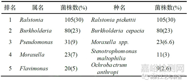 純化水為飲用水經(jīng)蒸餾法、離子交換法、反滲透法或其他適宜的方法制備的制藥用水,不含任何附加劑。純化水可作為配制普通藥物制劑用的溶劑或試驗(yàn)用水,也可作為中藥注射劑、滴眼劑等滅菌制劑所用飲片的提取溶劑等[2]。Sandle[3]從6300個(gè)純水樣本篩選到315個(gè)超警戒線的樣本(歐盟藥典規(guī)定菌落數(shù)不得多于100 CFU·mL−1),并回收了347個(gè)分離株。主要屬、種如表2所示。從表2可見(jiàn)純化水微生物中主要的屬為Ralstonia和Burkholderia,而Ralstonia pickettii和Burkholderia cepacia為純化水中最主要的菌種。