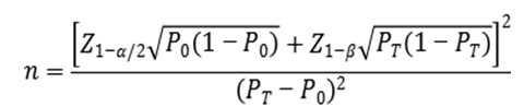 公式中,n為樣本量;Z1-α/2、Z1-β為顯著性水平和把握度的標準正態分布的分數位,P0為評價指標的臨床可接受標準,PT為試驗體外診斷試劑評價指標預期值。