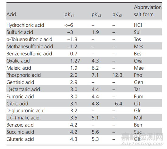 阿立哌唑溶解性較差,水溶性僅為7.8ug/mL,最強(qiáng)堿性位點(diǎn)的pKa為7.5。而去甲文拉法辛的水溶性為1.4mg/mL,比阿立哌唑高出近200倍,最強(qiáng)堿性位點(diǎn)的pKa為8.9。實(shí)驗(yàn)共選取了17種常用的酸,如硫酸、苯磺酸、富馬酸、檸檬酸、酒石酸等,具體種類及pKa值見下圖。