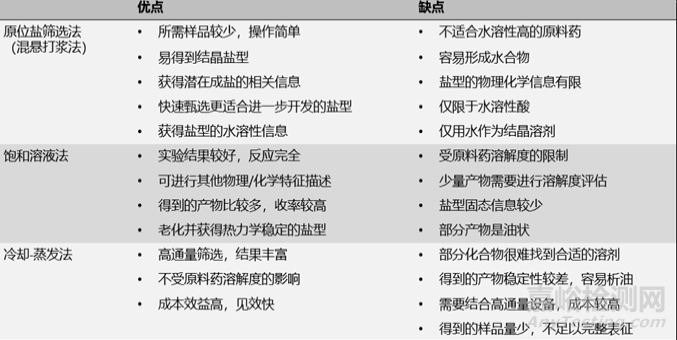 近年來,隨著高通量/自動(dòng)化技術(shù)的發(fā)展,鹽型篩選技術(shù)也得以廣泛應(yīng)用。目前常用的三種方法,原位鹽篩選(混懸打漿法)、飽和溶液法和冷卻-蒸發(fā)法。不同方法各有利弊,先看結(jié)論。