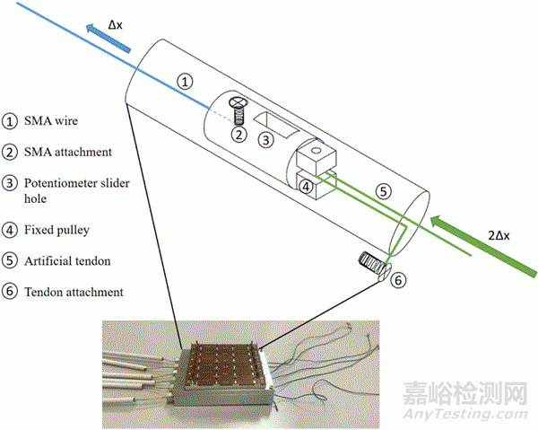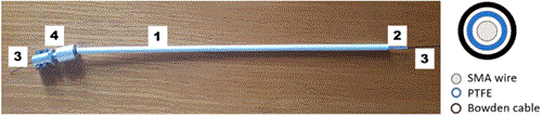 該研究開發(fā)的基于SMA的執(zhí)行器結構由SMA導線、聚四氟乙烯(PTFE)管和Bowden線組成。SMA線插入PTFE管中,然后,將帶有PTFE管的電線放入Bowden電纜中,為執(zhí)行器提供靈活性。導線的一側用端子單元固定,而另一側則未連接。因此,Bowden線能夠傳輸 SMA線的運動。因此,產(chǎn)生了所需的位移。基于SMA的執(zhí)行器和原理圖組裝概念如圖2所示。