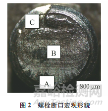 某動車機組翻板鎖鎖舌的固定傳動螺栓發生斷裂,翻板鎖內部結構宏觀形貌如圖1所示。轉子在把手順時針轉動時,通過螺栓帶動鎖舌壓縮彈簧縮入,松開把手時鎖舌被壓縮彈簧彈出,螺栓推動轉子和把手復位。螺栓在使用過程中承受徑向的交變應力,螺栓規格為M4A2-70。采用顯微鏡對螺栓斷口進行觀察,斷口的宏觀形貌如圖2所示。斷口大致可分為斷裂起始區A,裂紋擴展區B和最終斷裂區C。斷口有明顯的疲勞弧線,斷裂性質為疲勞斷裂,且有多個裂紋源。