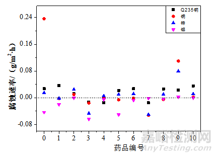 由于復配成分對鋼(Q235)、銅、鋅、鋁可能存在不相容問題,本文通過對四種金屬與10種常用防銹材料的腐蝕性、緩蝕性進行研究,從而為多金屬用氣相防銹劑的選材提供一定的數據支持。
