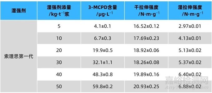 2)將不同的濕強劑按一定比例添加到紙漿中,測試紙張中的氯丙醇水提取量變化情況;
