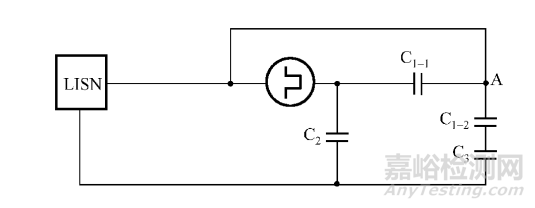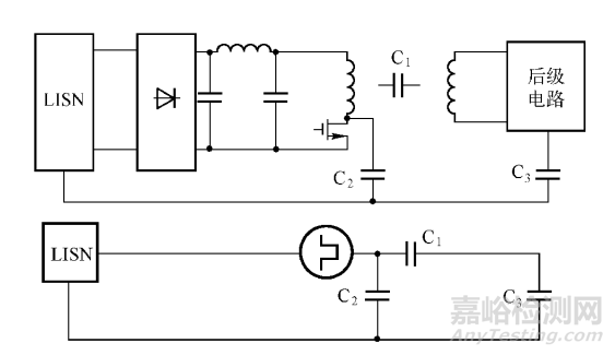 在圖中可以看出,這種分布電容一方面會加大騷擾的傳遞路徑,還會使得LISN接收到更多的電流,使得傳導騷擾測試超過限值。上圖的等效電路如下圖所示: