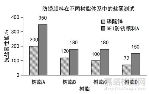 (1)離子交換型防銹顏料在多種環(huán)氧酯樹脂中抗鹽霧性能都明顯優(yōu)于磷酸鋅,表明其具有很強(qiáng)的通用性。