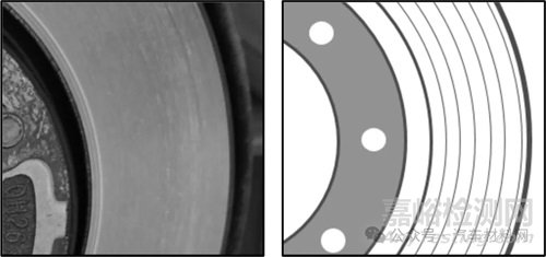 本研究采用的制動盤為某OEM車型的量產產品,其原始加工狀態為磨削方式,加工紋路為雜亂的發射狀,磨削制動盤表面狀態及加工紋路示意如圖1所示。為了研究不同制動盤表面狀態的性能,對制動盤進行車削加工處理,得到同心圓型加工紋路,車削制動盤表面狀態及加工紋路示意如圖2所示。
