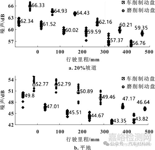 圖3是兩種制動盤匹配相同的摩擦片在平地和20%坡道上的蠕動噪聲。蠕動噪聲結果顯示,車削制動盤的蠕動噪聲總體上低于磨削制動盤,但是無論是哪種制動盤,在平地上的蠕動噪聲均較20%坡道上好。