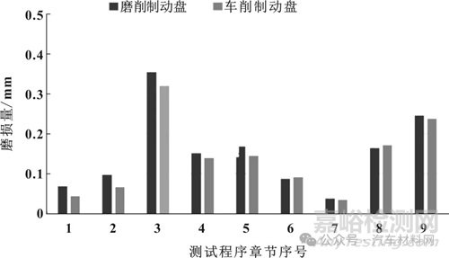 對不同種類的制動盤,采用SAE J2707A的程序研究了摩擦副的磨損性能,如圖9所示。由圖可以看到,磨削制動盤對應的摩擦片在第1至第3章節的磨損量,均高于用車削制動盤的摩擦片,這與其前期摩擦因數較高的結果是一致的。