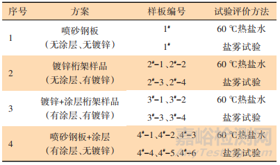 在現場光伏大規模試驗的同時,為驗證桁架防腐方案的可靠性,使用桁架截取的小樣和同材質試驗鋼板進一步對防腐效果進行試驗評價。試驗方案如表3所示。