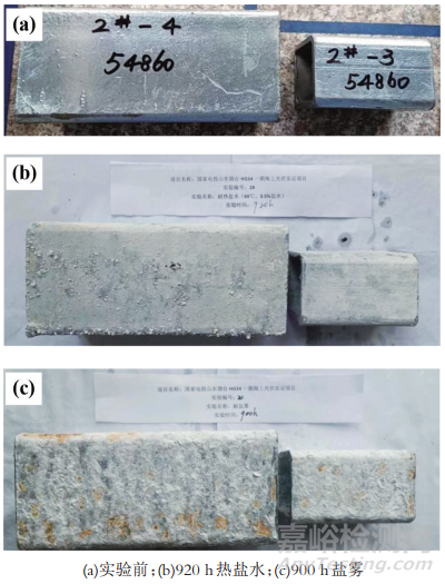 試驗所用鍍鋅小樣為現場桁架截取,鍍鋅厚度為105μm;3#鍍鋅+涂層設計為105μm鍍鋅層、60μm鍵合型環氧連接漆、120μm鍵合型環氧中間漆、80μm高耐候脂肪族聚氨酯面漆;4#涂層設計為80μmJ專用環氧底漆、200μm鍵合型環氧中間漆、80μm高耐候脂肪族聚氨酯面漆。試驗中,耐熱鹽水試驗環境為60℃、3.5%氯化鈉溶液,耐鹽霧試驗環境為鹽霧試驗箱中標準鹽霧環境。鍍鋅+涂層方案以及涂層方案實驗依據JTS153-2015《水運工程結構耐久性設計標準》設計。