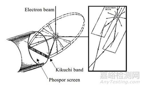 電子背散射衍射儀一般安裝在掃描電鏡或電子探針上。樣品表面與水平面呈 70°左右。當入射電子束進入樣品后,會受到樣品內(nèi)原子的散射,其中有相當部分的電子因散射角大逃出樣品表面,這部分電子稱為背散射電子。背散射電子在離開樣品的過程中與樣品某晶面族滿足布拉格衍射條件2dsinθ =λ的那部分電子會發(fā)生衍射,形成兩個頂點為散射點、與該晶面族垂直的兩個圓錐面,兩個圓錐面與接收屏交截后形成一條亮帶,即菊池帶。每條菊池帶的中心線相當于發(fā)生布拉格衍射的晶面從樣品上電子的散射點擴展后與接收屏的交截線,如下圖所示。一幅電子背散射衍射圖稱為一張電子背散射衍射花樣(EBSP)。一張EBSP往往包含多根菊池帶。接收屏接收到的EBSP經(jīng)CCD數(shù)碼相機數(shù)字化后傳送至計算機進行標定與計算。值得指出的是,EBSP來自于樣品表面約幾十納米深度的一個薄層。更深處的電子盡管也可能發(fā)生布拉格衍射,但在進一步離開樣品表面的過程中可能再次被原子散射而改變運動方向,最終成為EBSP的背底。因此,電子背散射衍射是一種表面分析手段。其次,樣品之所以傾斜70°左右是因為傾斜角越大,背散射電子越多,形成的EBSP花樣越強。但過大的傾斜角會導致電子束在樣品表面定位不準,降低在樣品表面的空間分辨率等負面效果,故現(xiàn)在的EBSD都將樣品傾斜70°左右。