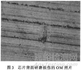 硅片減薄,一般采用磨削法,是利用固定在特定模具上的尺寸適宜的金剛砂輪對硅片背面進行磨削,磨片引起的背面損傷(如圖3)極大地影響了硅片的強度,尤其在硅片不同介質層的作用下,薄硅片很容易彎曲變形,產生了碎裂隱患。