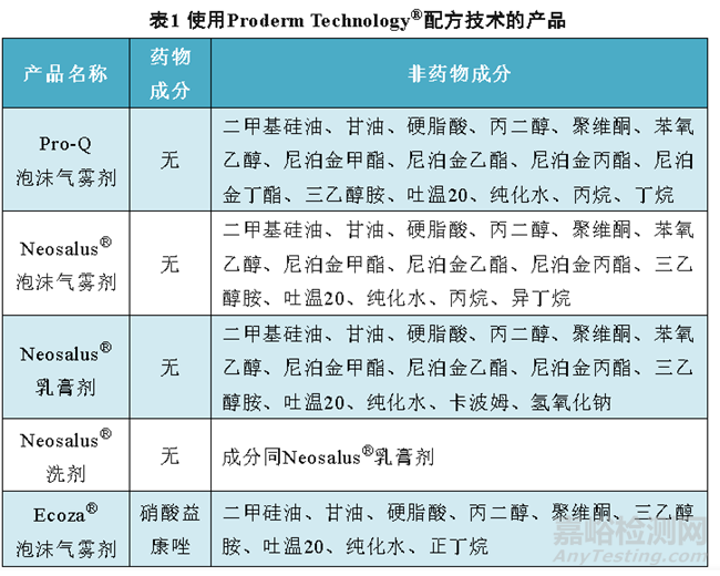 事實上,上述5種外用制劑產品均使用Proderm Technology®配方技術。表1總結對比了Pro-Q泡沫氣霧劑、Neosalus®泡沫氣霧劑、Neosalus®乳膏劑、Neosalus®洗劑和Ecoza®泡沫氣霧劑的處方組成,不難看出這5種產品成分相似度很高。