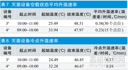 滅菌設備空載狀態平均升溫速率數據見表7,滅菌設備冷點升溫速率見表8,3#滅菌設備平均升溫速率和冷點升溫速率均高于4#滅菌設備。從產品進入設備到暴露的過程中,3#可以使產品升溫速率更高,更容易滅菌。