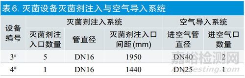 分別對兩臺滅菌設備的滅菌劑注入管路、滅菌劑注入點位進行對比,系統配置信息詳見表6。兩臺設備的滅菌劑注入管路均采用Φ8mm紫銅管,能夠保證高壓液態混合氣體的流量基本穩定且充分氣化、經過氣化器后為直徑DN16的不銹鋼管。兩臺設備滅菌劑加注口間距在1440~1950mm,每個滅菌劑加注口所覆蓋的空間相差不大,則滅菌劑進入產品的分布路徑基本一致。滅菌劑注入、空氣導入的點位數量和管道直徑均按不同容積進行匹配,每個加注口的間距及所覆蓋的范圍和導入空氣點位的速率也比較接近。