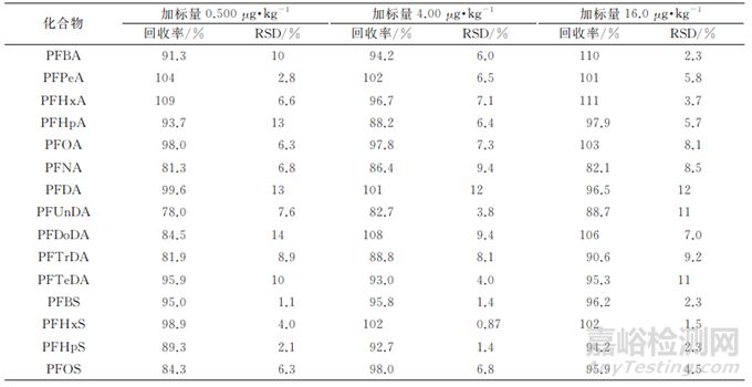 在空白雞蛋樣品中加入一定量的混合標準溶液,使15種PFCs加標量為0.500,4.00,16.0μg·kg-1,渦旋混勻,放置過夜,使樣品基質與目標物充分接觸,然后按照試驗方法進行處理及測定,每個加標濃度水平測定6份平行樣,計算回收率和測定值的相對標準偏差(RSD),結果見表3。
