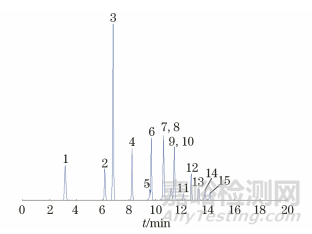 在優化的色譜、質譜條件下,15 種PFCs混合標準溶液的總離子流色譜圖見圖1。