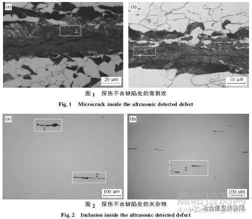 在鋼板探傷不合缺陷處取樣,進行金相、掃描電鏡分析,得出缺陷處的微觀缺陷表現為位于鋼板中心厚度的微裂紋、夾雜,如圖1、圖2所示。