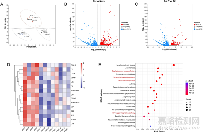 圖8 PAHT水凝膠抑制增生性瘢痕形成的機理分析。(A)正常組、對照組和PAHT三組的主成分分析。(B)對照組與正常組和(C)PAHT與對照組的差異基因火山圖。(D)差異基因熱圖。(E)對照組與正常組中上調、PAHT與對照組中下調交集基因的KEGG通路分析。