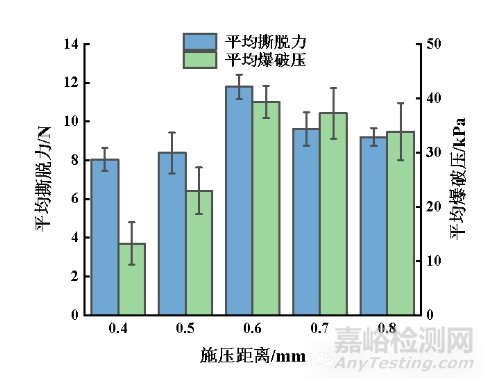 為了研究施壓距離與吻合口強度之間的關系,本文進行了撕脫力和爆破壓實驗。隨著施壓距離的增大,吻合口的力學性能逐漸增強,當施壓距離為0.6 mm時,達到最大吻合強度,此時組織的撕脫力為(11.79±0.64) N,爆破壓為(39.32±2.99) kPa,遠大于文獻中血管極限拉伸時的軸向拉力,同時,達到病理性收縮壓的范圍。隨著施壓距離的進一步增加,吻合口力學性能開始下降。當施壓距離為0.4 mm時,組織的爆破壓為(13.25±3.87) kPa,小于正常情況下人的生理動脈壓,而其他施壓距離下,組組織的爆破壓均高于生理動脈壓(見圖3)。