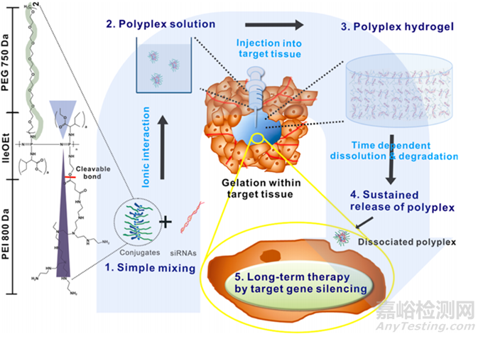 據另一項研究報道3,韓國科技技術研究所制備了一種可注射的具有可裂解酯鍵的熱敏陽離子聚合物-低分子量聚乙烯亞胺聚(有機磷腈)共軛物,該共軛物可以與siRNA形成100nm的多聚物,該多聚物在體溫環境下通過疏水作用轉為多聚物水凝膠,藥物通過該聚合物的溶解和降解從水凝膠中緩慢釋放,可以實現長達4周的基因沉默。