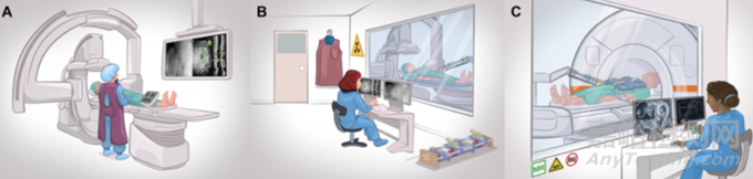 技術的最新進展使機器人輔助血管內和非血管介入手術的得到改進。IR中的機器人系統可以解決該領域很多的缺點,即患者和醫護人員都暴露在電離輻射中(圖A)。此外,在IR中使用機器人系統的其他潛在好處包括提高治療精度,減少操作時間,以及減少達到目標所需的重新調整次數。
