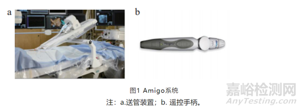 Amigo用于血管介入電生理治療的遠程導管系統。Amigo系統由一個安裝在電生理臺上的送管裝置和一個有線控制器組成 。Amigo不需要單獨的工作站,可以與現有的透視技術結合確定導管位置并通過控制器操作導管。Amigo是一個開放式平臺,能夠兼容現有的商用導管,降低了使用成本。導管被放置在擴展底座內,介入醫生可以通過控制器在30m外進行控制。控制器可以實現導管插入、回撤和旋轉以及導管頂端偏轉。通過控制器的前進、后退按鈕可以控制滑軌的前進和后退,從而實現導管的插入與回撤,導管運動速度為每秒13mm,最小控制精度為1.6mm。介入醫生旋轉控制器的最前端旋鈕實現轉臺的旋轉,帶動導管進行 360° 旋轉。旋轉控制器中間的旋鈕可以實現導管的遠端彎曲