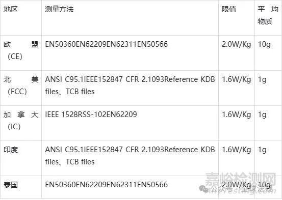 其他海外國家(部分)的SAR測試標準及限值要求可參見下表:
