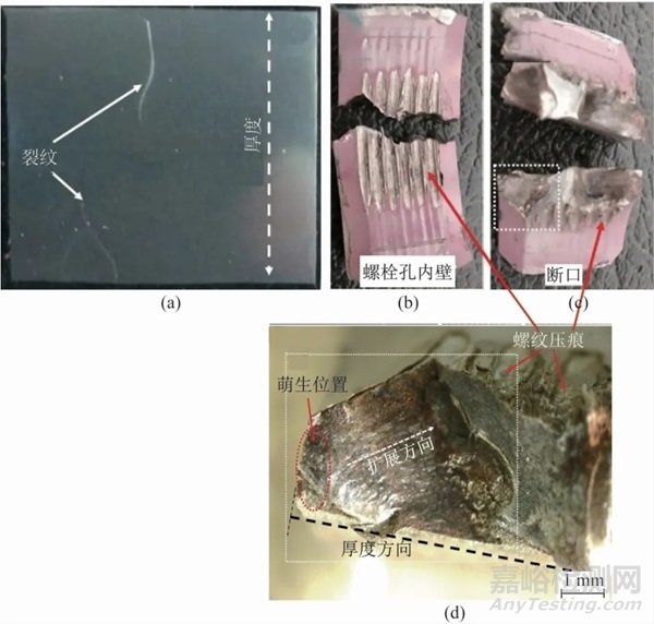 采用線切割從疲勞失效的螺栓孔處取樣,檢測裂紋部位的微觀組織、夾雜物及斷口形貌,如圖4(a)所示。同時,在靠近螺栓孔內壁裂紋處切取斷口試樣,在開裂區域取樣進行金相檢驗。在螺栓孔內壁發現嚴重磨損,連接螺栓在螺孔內壁靠近裂紋一側出現明顯的螺紋壓痕,如圖4(b)所示。說明在疲勞試驗過程中,由于輪輻與連接件之間發生了滑移從而導致螺栓傾斜與內壁接觸,產生壓痕,這也從另一方面驗證了疲勞試驗過程中輪輻發生了微動磨損。在失效輪輻其他螺栓孔中相同方向的內壁也發現有這種現象。