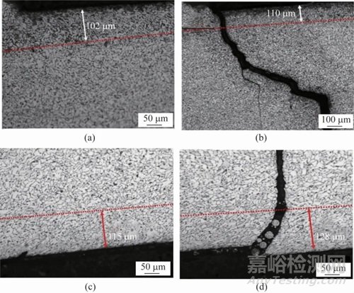 從斷口形貌可知,在彎曲疲勞試驗中,連接件或螺栓墊片在與輪輻的接觸面發生了微動磨損,致使輪輻的上下表面發生塑性變形,如圖8 所示。從圖8(b,d)可明顯看出,裂紋起始于晶粒變形區,其擴展方向基本與晶粒變形方向一致,即摩擦副相對運動的方向。變形層深度可達100 mm,并且裂紋附近變形層更深。從圖8(b,d)可知,輪輻上下表面開裂處的晶粒變形深度分別為110 和128 mm。