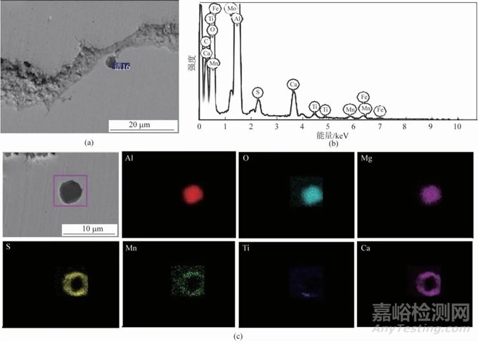 對疲勞裂紋邊部一球形夾雜物進行了能譜分析,結果顯示,該夾雜物具有鎂鋁尖晶石結構,如圖10(a ~b)所示。對另一球形夾雜物進行面掃描,結果表明,這類球形夾雜物內部為Al2O3 和MgO,外層為Mn、Ca、Ti的硫化物,如圖10(c)所示。