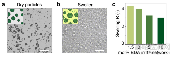 為了探究彈性體微粒在不同交聯(lián)劑濃度下的膨脹行為,作者展示了干燥狀態(tài)和在彈性體前驅(qū)體溶液中膨脹后的微粒形態(tài),通過比較這兩種狀態(tài)下微粒的直徑,計(jì)算出膨脹比(圖2)。結(jié)果顯示,隨著微粒中交聯(lián)劑濃度的增加,彈性體微粒的膨脹比降低,這意味著微粒的體積膨脹程度減小。這一現(xiàn)象表明,通過調(diào)節(jié)微粒中的交聯(lián)劑含量,可以有效地控制微粒的膨脹程度,進(jìn)而影響最終3D打印DNGEs的機(jī)械性能。