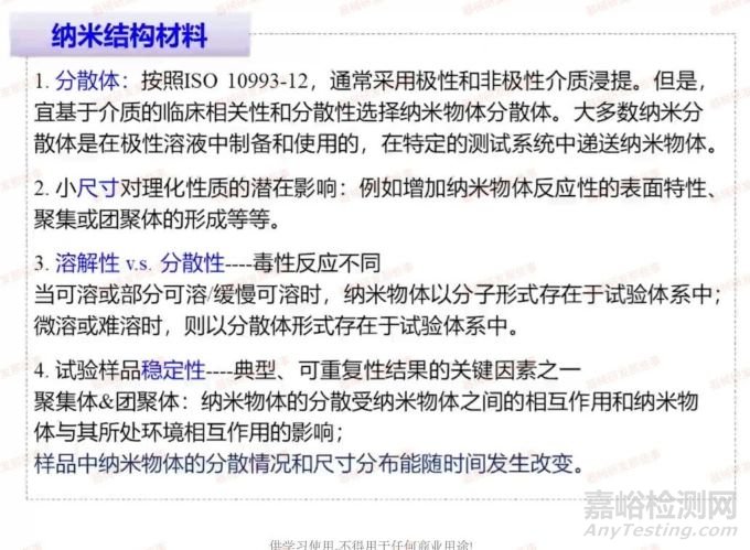 對于納米結(jié)構(gòu)材料和分散體,按照ISO 10993.12樣品制備,通常采用極性和非極性介質(zhì)浸提。然而,需要注意基于介質(zhì)的臨床相關(guān)性和分散性,選擇納米物體和分散體。大多數(shù)納米分散體在極性溶液中制備和使用,在特定測試系統(tǒng)中遞送納米物體時,需要注意增加納米物體反應(yīng)性的表面特性,如聚集或團(tuán)聚體的形成,這些小尺寸對理化性質(zhì)的潛在影響。