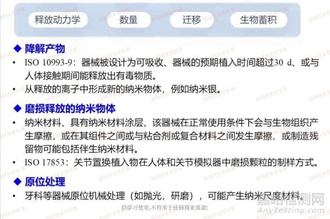 包括釋放數(shù)量是否發(fā)生遷移以及是否有生物蓄積。這種釋放可能是降解產(chǎn)物的釋放,如含銀輔料中納米銀成分的釋放,以及磨損導(dǎo)致的納米物體釋放,如關(guān)節(jié)置換植入物在使用過程中磨損顆粒的納米物體釋放。此外,還包含原位處理,如齒科材料,在機(jī)械拋光和研磨過程中也可能產(chǎn)生納米制作材料。